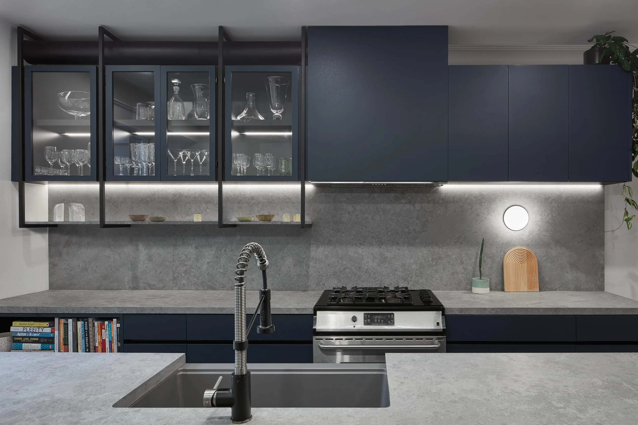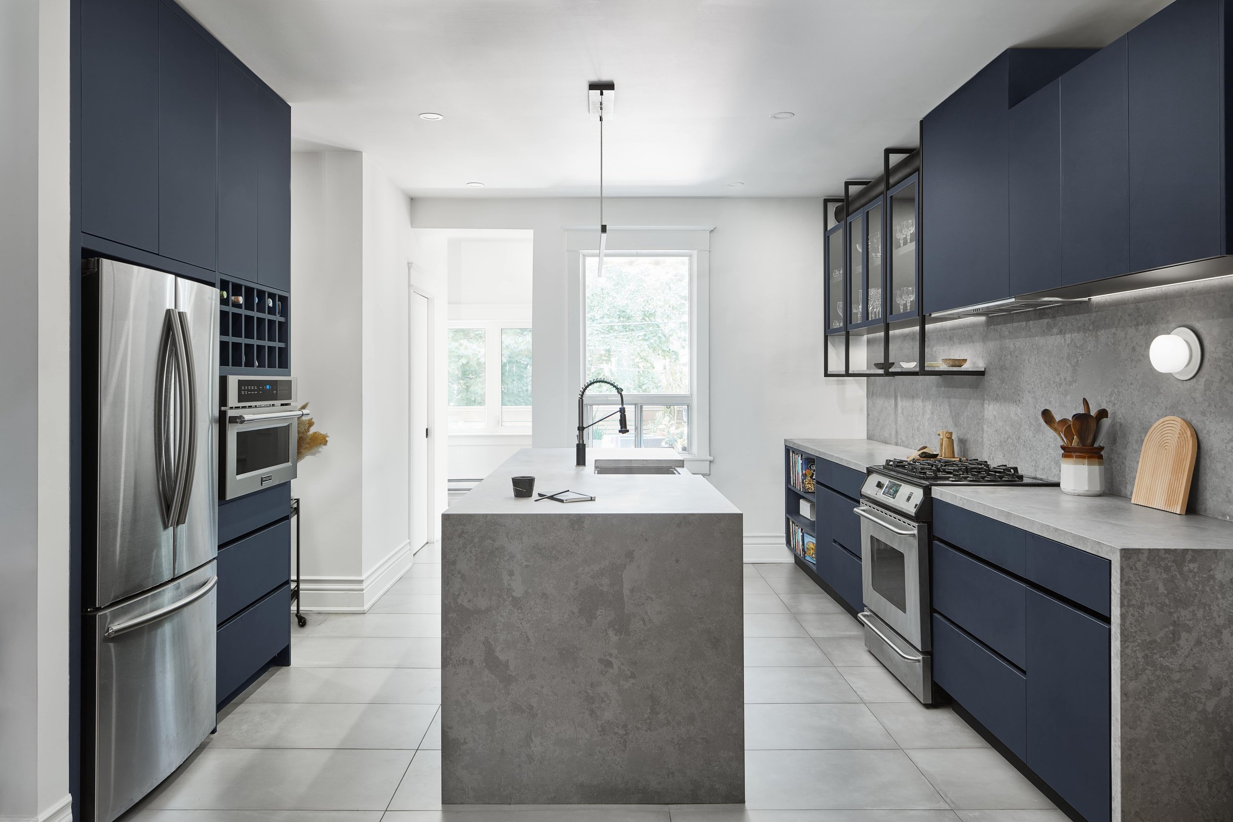 At its core, the project establishes a dialogue between contemporary design and traditional craftsmanship. Features such as a glass block window, intricate moldings, and subtle material transitions are thoughtfully preserved and celebrated, contrasting with sleek, modern interventions. By reorienting the kitchen, physical and visual barriers between communal spaces are removed, creating a seamless flow for cooking, dining, and gathering. Expansive rear windows draw in natural light, brightening the interiors and strengthening the home’s connection to its surroundings.